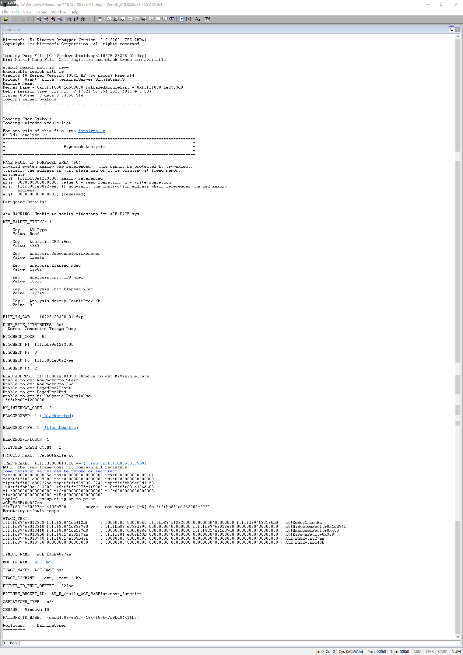 今天更新后,点击启动游戏,弹出ACE加载进程和上图进程,然后蓝屏 终止代码:PAGE_FAULT_IN_NONPAGED_AREA 失败的操作:ACE.BASE.SYS 内存检测未发现问题,管理员启动也不行,换硬盘也不行,未还原系统 | |